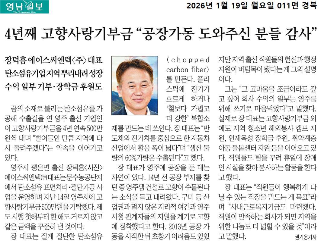 [언론보도] 에이스씨엔텍(주) 장덕흠 대표, 영주시에 4년 연속 고향사랑기부 (경북신문 2026-01-15)